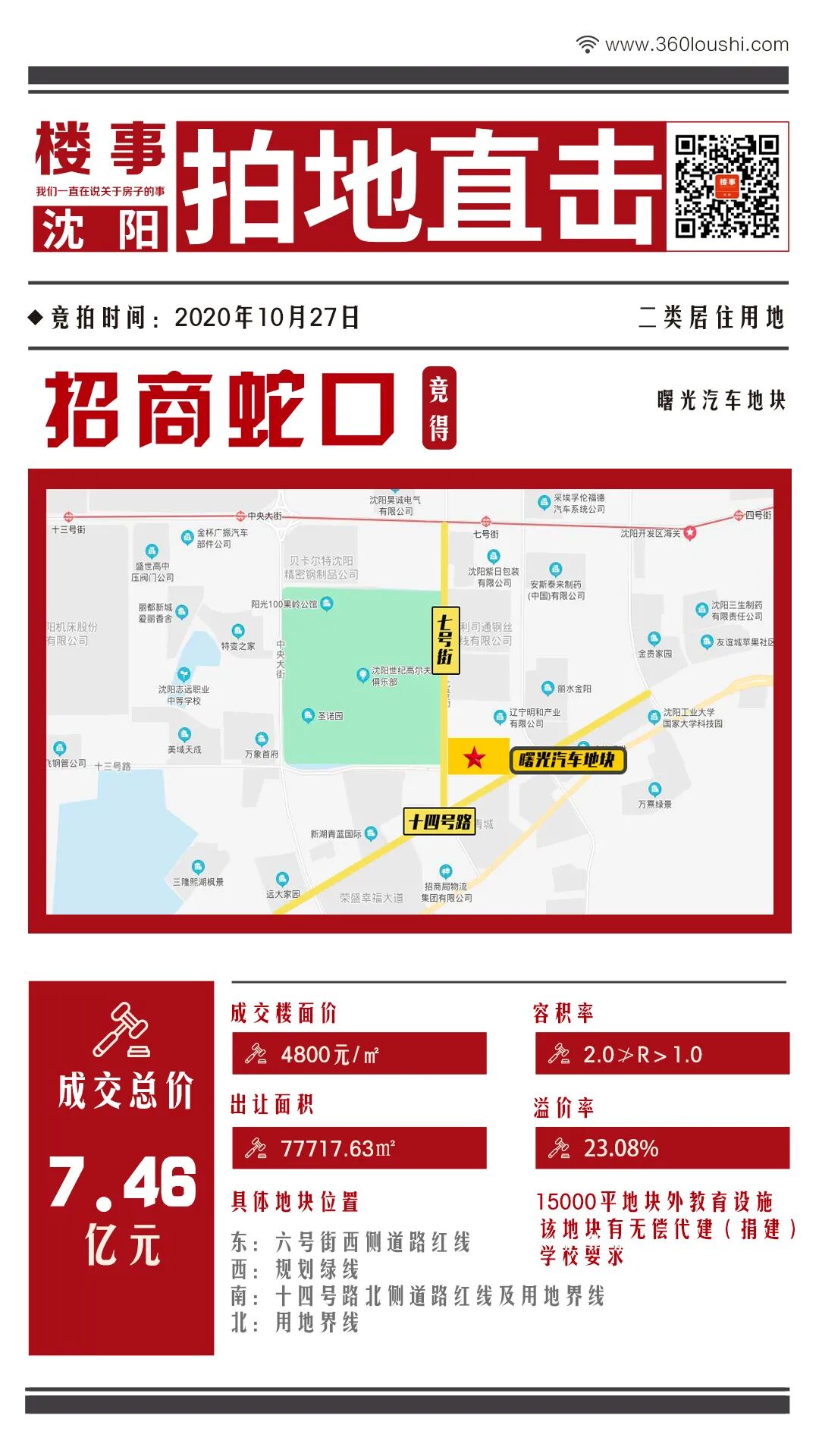 曙光汽车:地块起拍价3900元/建筑平方米,最终以4800元/建筑平方米+15000㎡地块外教育设施的价格被竞买人招商蛇口摘得,总价7.46亿元,溢价率23.08%。该地块有无偿代建学校要求。
