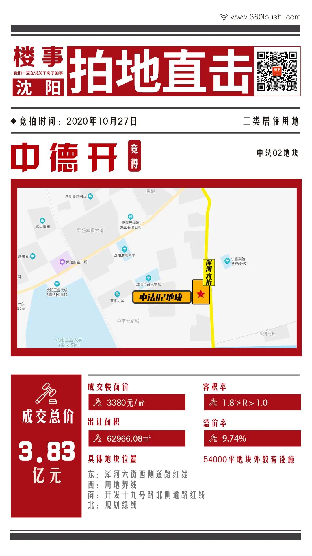 中法02地块起拍价3080元/建筑平方米,最终以3380元/建筑平方米+54000㎡地块外教育设施的价格被竞买人中德开摘得,总价3.83亿元,溢价率9.74%。